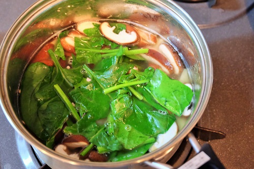むきえびを熱湯で臭みをとり、5cm程度にザクザクに切ったほうれん草と一緒に鍋に入れて2分ぐらい煮込めば皿に盛る。